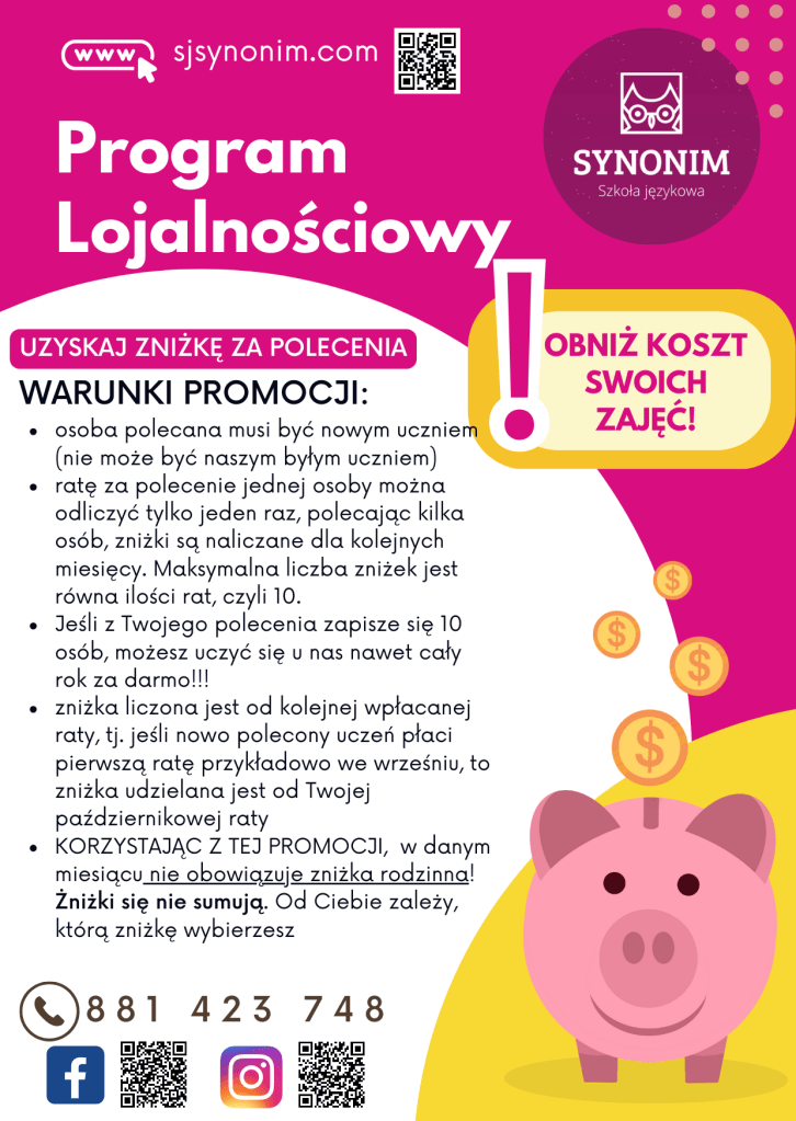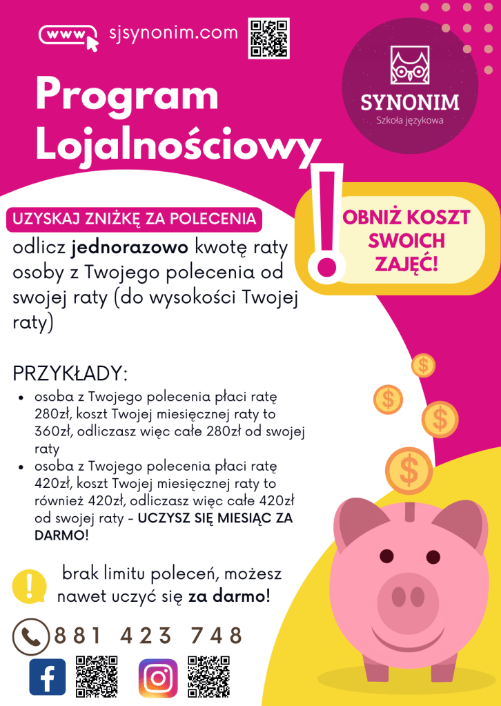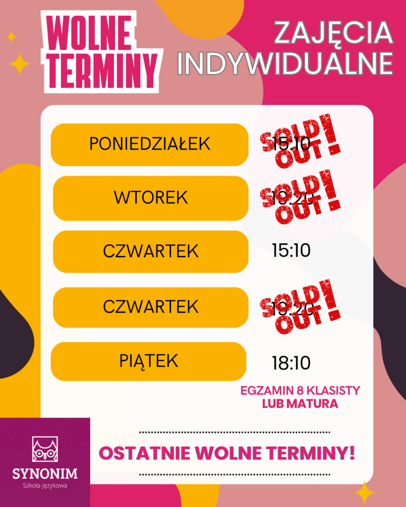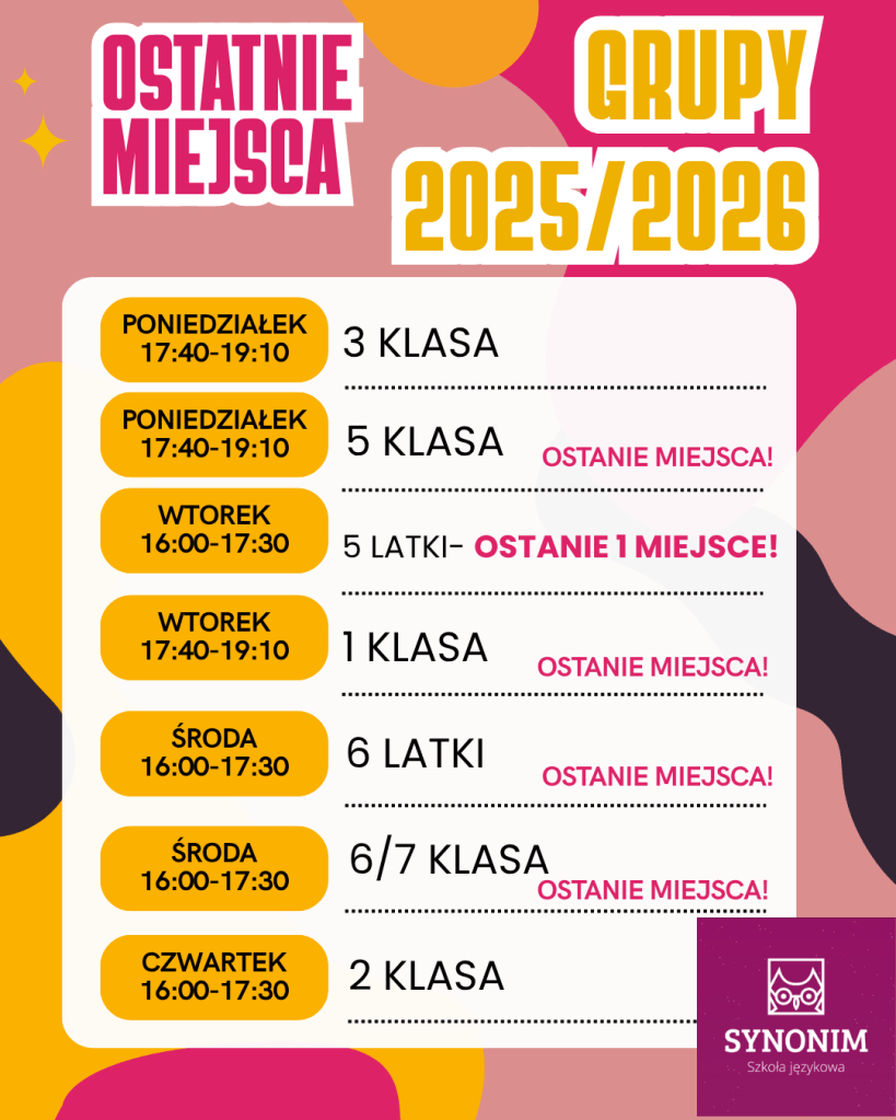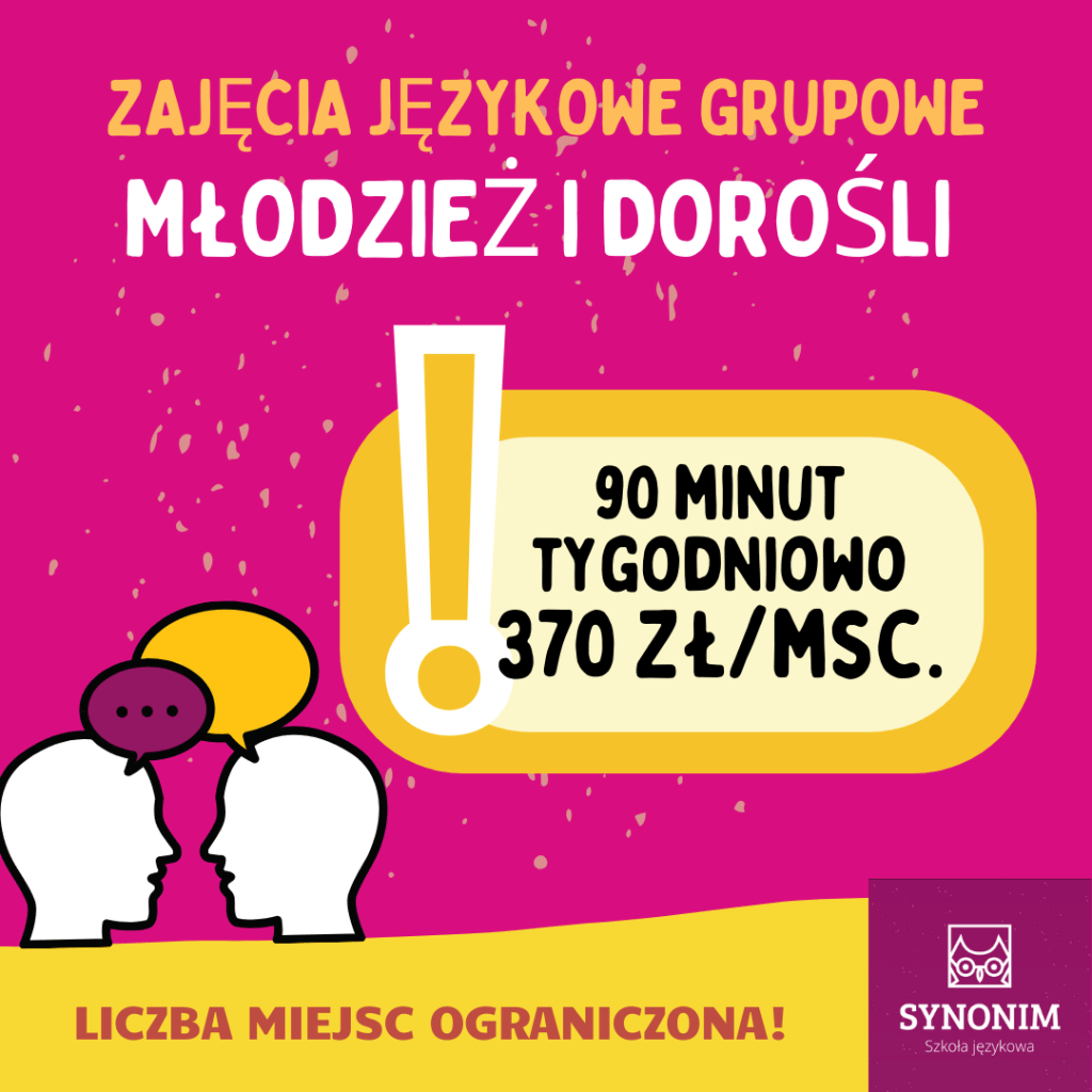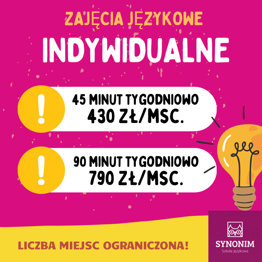 W naszej ofercie na rok szkolny 2025/2026 znajdziecie zarówno kursy grupowe jak i indywidualne. Szczegółowe informacje w zakładkach ZAJĘCIA GRUPOWE oraz ZAJĘCIA INDYWIDUALNE